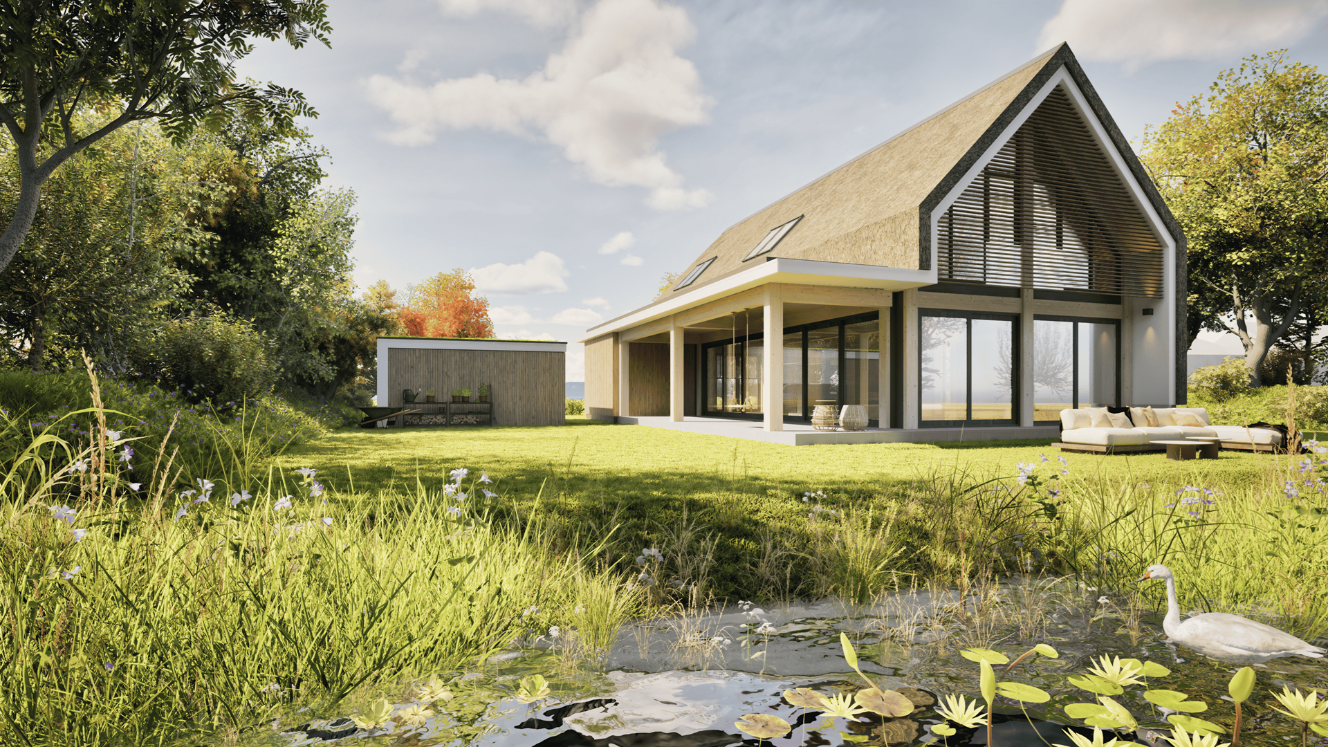 Elke kavel biedt volop ruimte voor een royale woning en een fraai aangelegde tuin. De situering van de kavels zorgt voor prachtige vergezichten over water en weilanden. De toegangsweg, parkeerplaatsen en groene zones worden als mandelig eigendom ingericht, wat betekent dat onderhoud gezamenlijk wordt verzorgd. Achter de kavels komt een zonnepark voor duurzame energieopwekking, eveneens in gezamenlijk eigendom. Per woning worden er tien zonnepanelen geplaatst om in de energiebehoefte te voorzien.