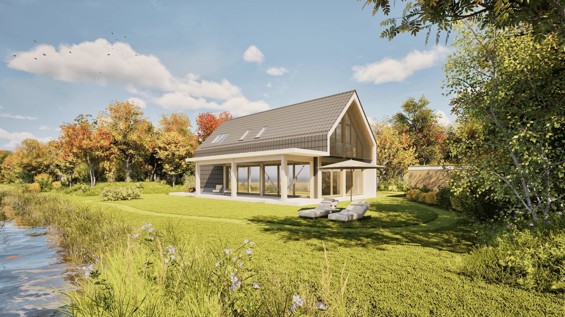 Elke kavel biedt volop ruimte voor een royale woning en een fraai aangelegde tuin. De situering van de kavels zorgt voor prachtige vergezichten over water en weilanden. De toegangsweg, parkeerplaatsen en groene zones worden als mandelig eigendom ingericht, wat betekent dat onderhoud gezamenlijk wordt verzorgd. Achter de kavels komt een zonnepark voor duurzame energieopwekking, eveneens in gezamenlijk eigendom. Per woning worden er tien zonnepanelen geplaatst om in de energiebehoefte te voorzien.